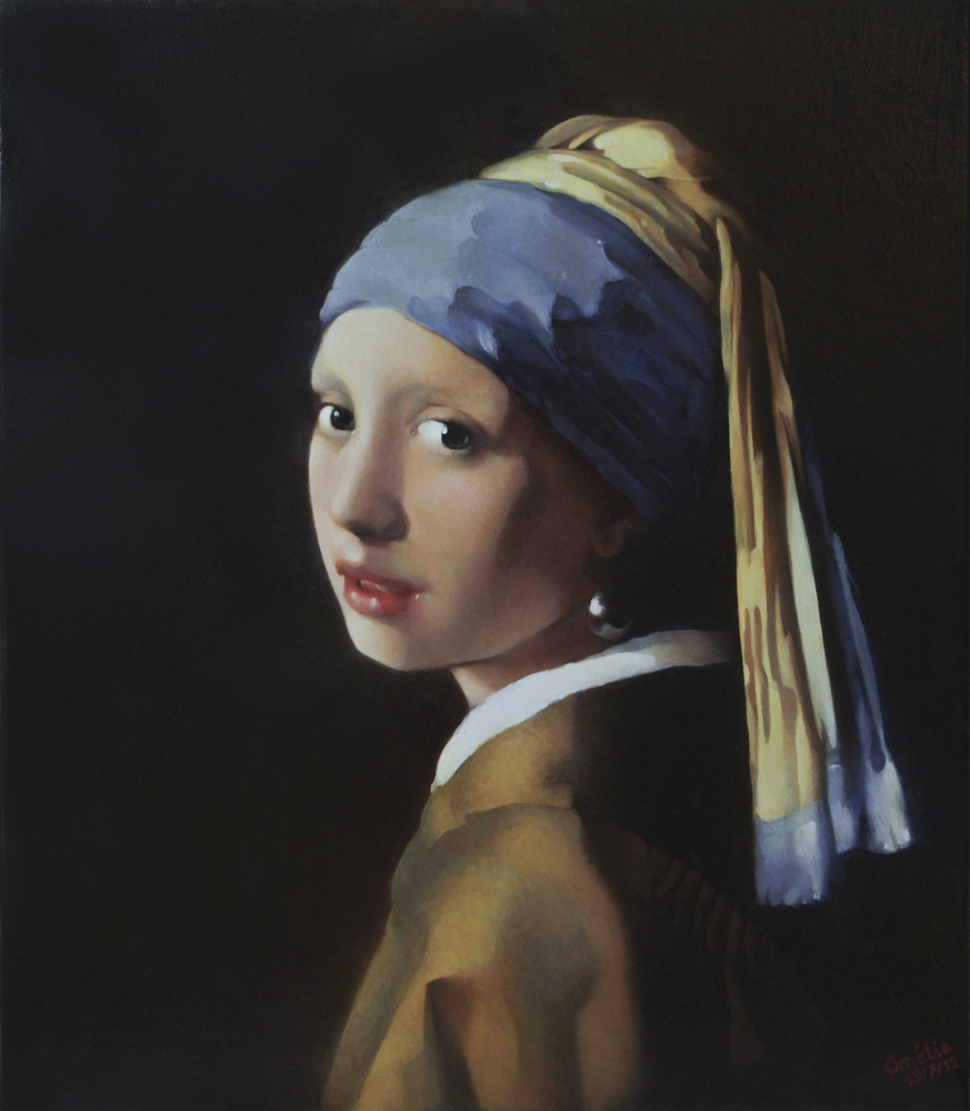 Amélie, Nous avons quelques peintures venant d’artistes australien, new-yorkais, brésiliens, vénézuéliens et bien d’autres. C’est l’histoire de toute une vie en Asie et Amérique Latine et autres pays. Cependant, quelques temps avant son anniversaire, mon épouse me signale son tableau préféré depuis très longtemps: « La Jeune Fille à la Perle », Vermeer. Là, voulant garder cet achat secret, j’avais un sérieux problème car cette œuvre, il y a 5 ans, était difficile à trouver en copie d’artiste. Puis j’ai trouvé quelques mots qui disaient « travail soigné, très fidèle ». J’ai décidé sur cela. La livraison s’est faite, après plusieurs mois, dans un lieu digne du feuilleton « Passeur d’Enfants », avec Pierre Arditi. Dans un hall d’hotel, « emmailloté » tel un nouveau-né, ce tableau tant attendu est arrivé, apporté avec grands soins, par vous-même. Comme prévu, l’émotion était au rendez-vous. Nous avons ressenti votre tristesse à le laisser dans d’autres mains. Mais quelle surprise ! Il est splendide. Aux premiers regards, nous sommes restés immobiles de longues minutes entièrement captivés par cette incroyable atmosphère de Vermeer. Par cette courte missive nous tenons à vous féliciter pour votre travail remarquable. Pour qu’il rayonne au grand jour, nous l’avons placé sur le palier de notre escalier en fer forgé menant à la mezzanine. Ainsi, en fonction de l’heure du jour ou de la soirée, les effets de lumières naturelles tamisées, ou du soir, jouent à nouveau sur les talents de Vermeer que vous avez si bien su respecté. Encore bravo, nous espérons pouvoir repasser commande très vite. Cordialement, Jean-Louis DiDomenico